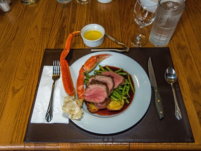 ALASKAN CRAB & WHOLE ROASTED CHATEAUBRIAND – served with Bearnaise sauce, caramelized onion and potato gratin, vegetable succotash. Lemon spongecake.