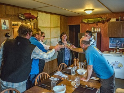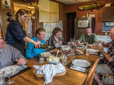 About 6:00 p.m. we get you back safe and sound to the lodge in time to pull your waders off, take a hot shower, and then gather in the main lodge for what we affectionately call “Liars Hour” where appetizers are served and stories are told. Depending on the menu, dinner is plated of served family style at 7:30.