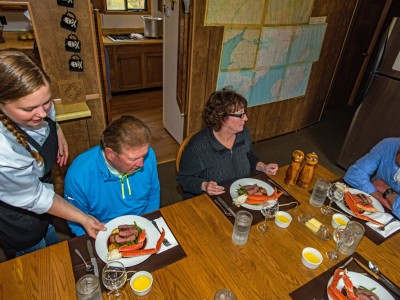 Start your morning with wake-up beverage service in your room about 6:00 a.m. Stroll in to the main lodge for breakfast. Meals are served family style, all you can eat. The breakfast menu changes up each day and consists of eggs, bacon, sausage, biscuits and gravy, potatoes, cold cereal, oatmeal, fresh fruit, baked goods and some clients’ favorite – bagels with cream cheese and smoked salmon.